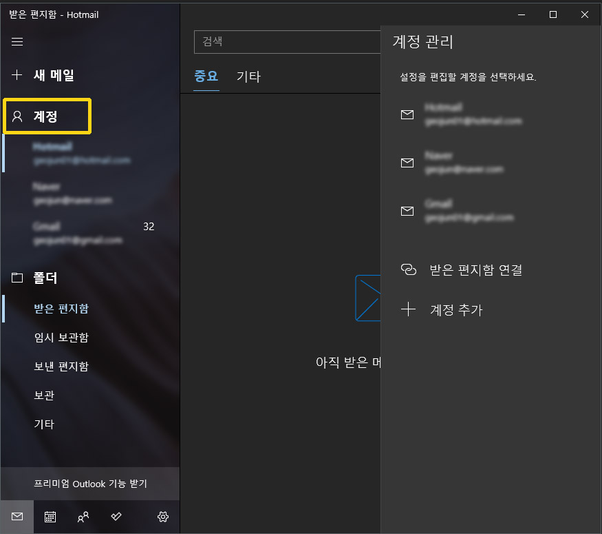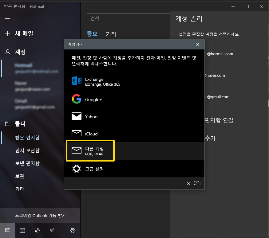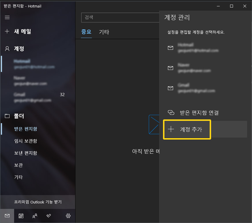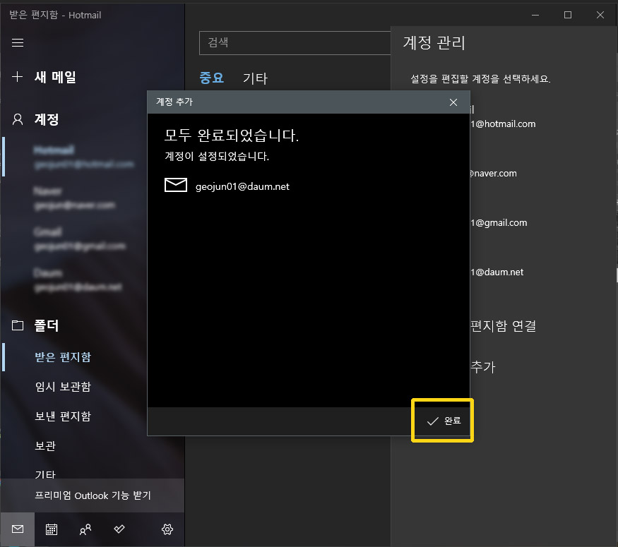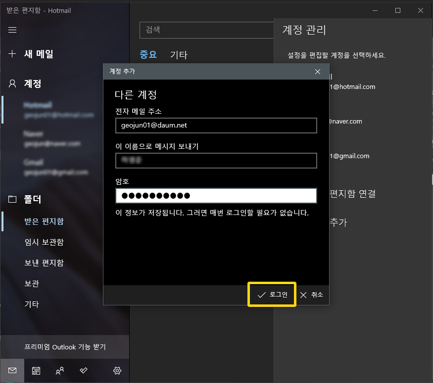 윈도우10 메일 앱 으로 여러 계정의 메일을 한곳에서 관리 하기.
