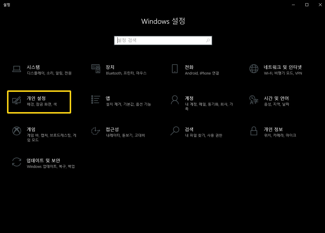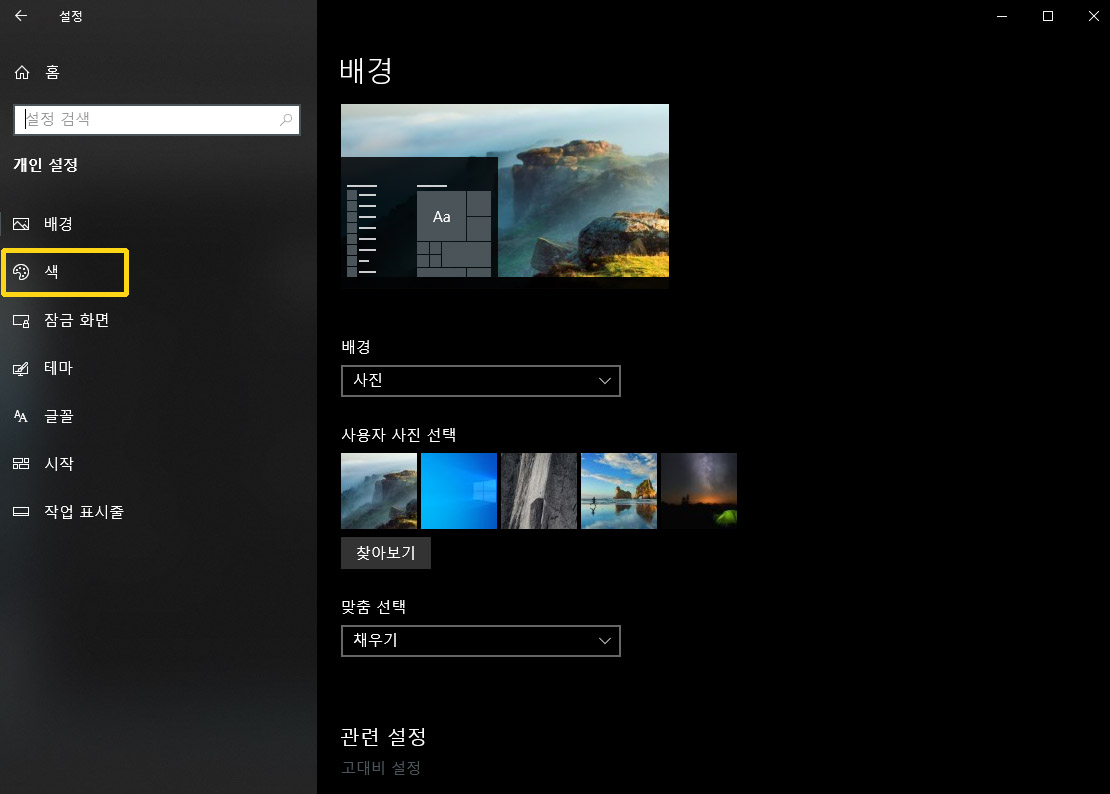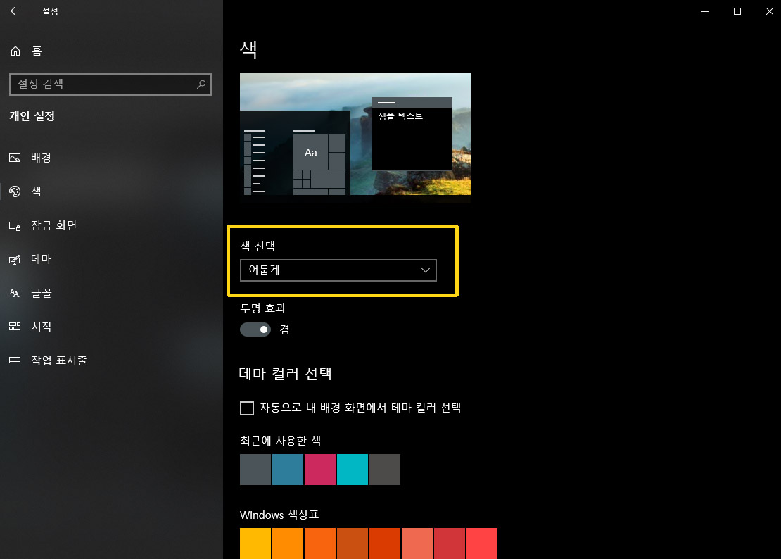 다크테마 선택후 밑에 보시면 Windows 색상표란게 있는데 여기서 칼라를 선택하시면