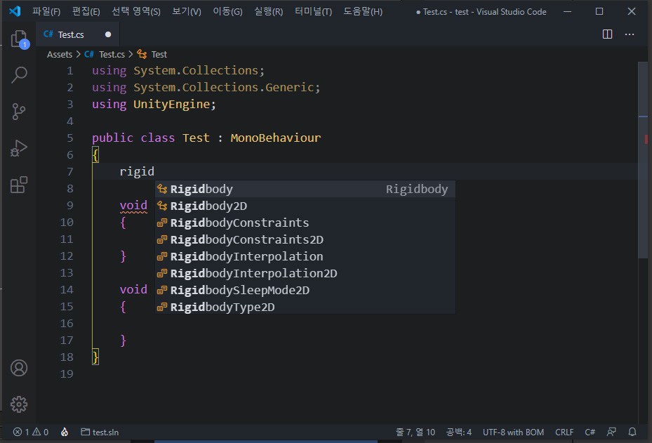 유니티에서 새 프로젝트를 만든 후 VSCode를 사용하려면 인텔리센스 및 기타 코드들에 문제가 발생합니다.