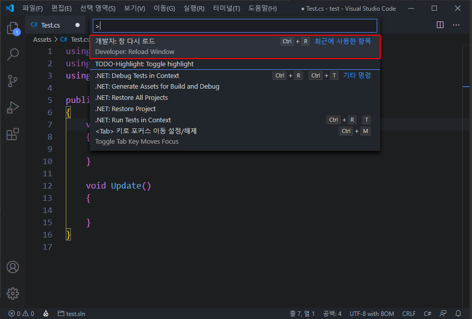 VSCode 에디터에서 Ctrl + Shift + p (보기 > 명령 팔레트) 클릭 후 사진의 빨간 테두리 "개발자: 창 다시 로드"를 클릭