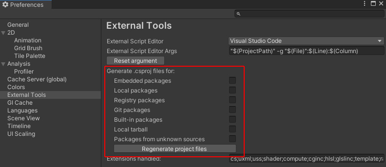 유니티의 Preferences의 External Tools에서 Visual Studio Code 하단의 빨간 테두리 안의 체크 박스를 모두 해제하신 후 "Regenerate project files"를 클릭 후 빠져나옵니다.