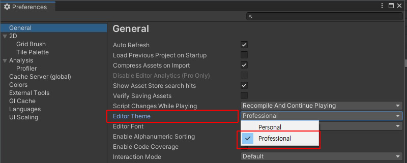 유니티 2020.1.2f1 버전과 2019.4.8 f1(LTS) 버전부터 다크 테마를 지원하고 있습니다.