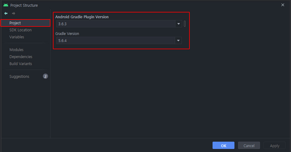 Project 오른쪽 화면의 Gradle version를 다운시켜 준 후 Apply 적용해 주시면 됩니다.