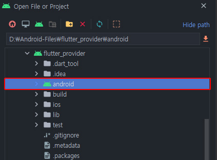 플러터가 열린 창에서 Project Structure.. 메뉴를 여시면 다른 화면이 나오니 안드로이드 파일이 열린 창에서 열어주셔야 합니다.