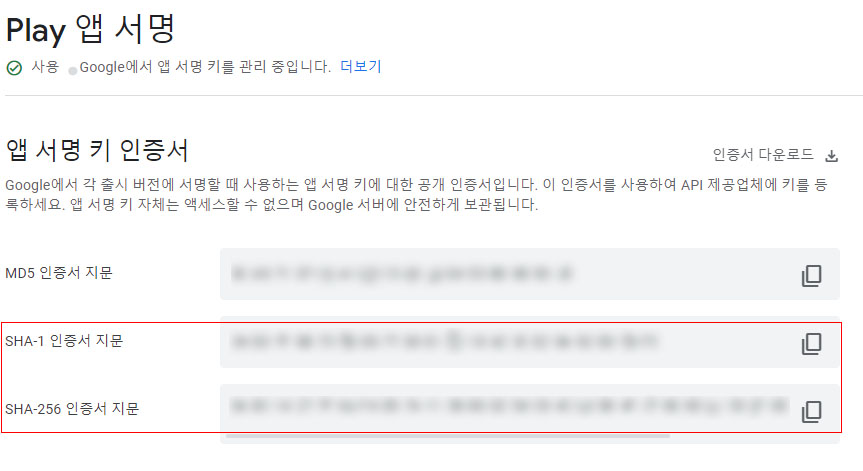 여기 등록된 SHA 인증서 지문을 등록해 주셔야 제대로 작동합니다.