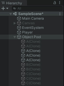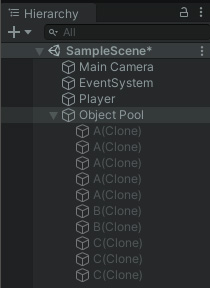 위 이미지와 같이 클론(Clone) 오브젝트가 수량에 맞게 생성되었으며 ObjectPool 밑으로 들어가 있습니다.