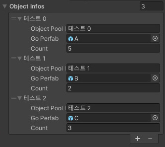 위에서 설명된 objectInfos에 등록된 오브젝트들의 생성 수가 각각 다릅니다. 이 모든 걸 objectPoolList에 담아 둡니다.