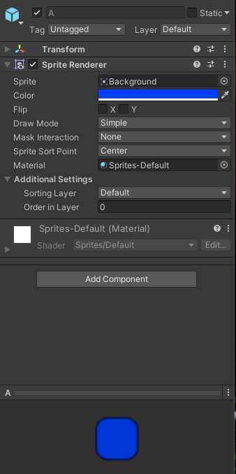 이제 유니티로 가서 빈 오브젝트 3개를 만들고 이름을 각각 A, B, C로 하며 Add Component에서 Sprite Renderer를 추가하고 기본 사각 이미지와 컬러를 따로 지정해 줍니다 그런 후 프리펩(PerFab)으로 만든 후 Hierarchy창에서 삭제합니다. (아래 이미지 참조)