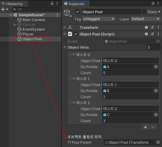 B오브젝트는 objectPoolList [1]에 C오브젝트는 objectPoolList [2]에 저장되어 있습니다.