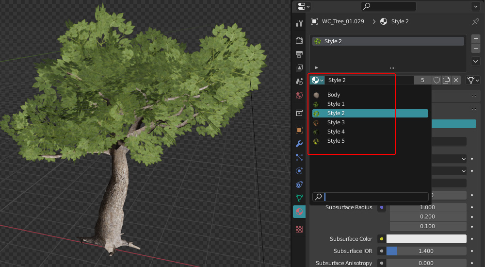 재질 설정을 다 해 주셨다면 3D 뷰에서 나뭇잎을 선택하신 후 오른쪽 재질 중 Style 1 ~ 5번 중 하나를 선택하시면