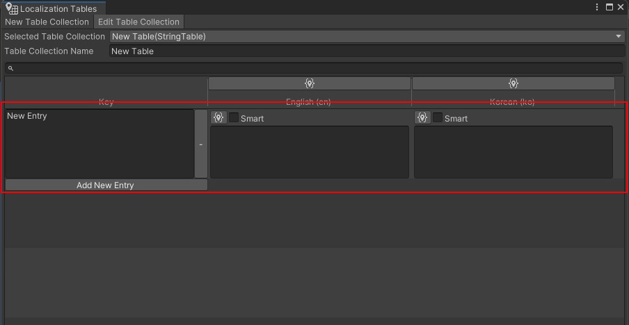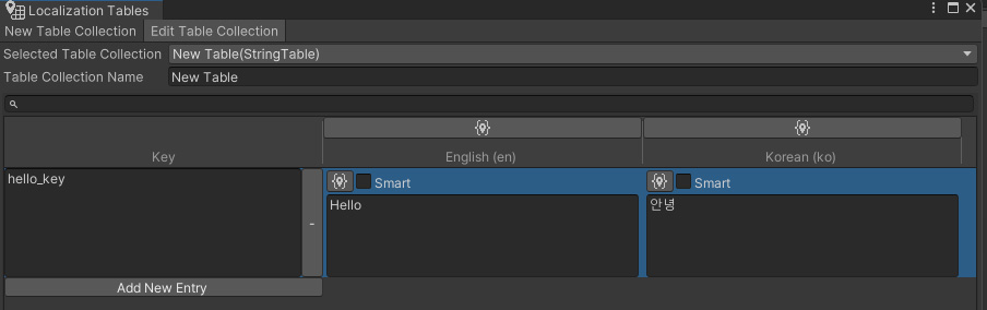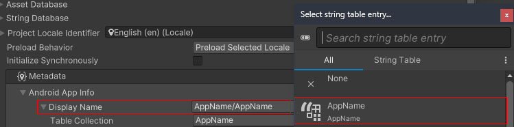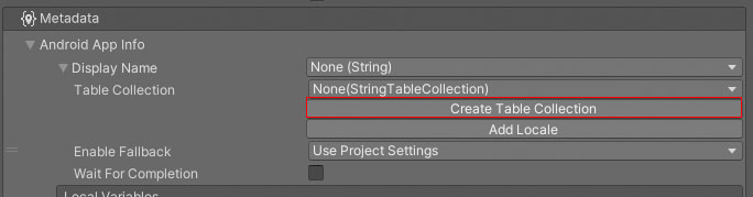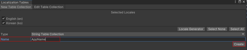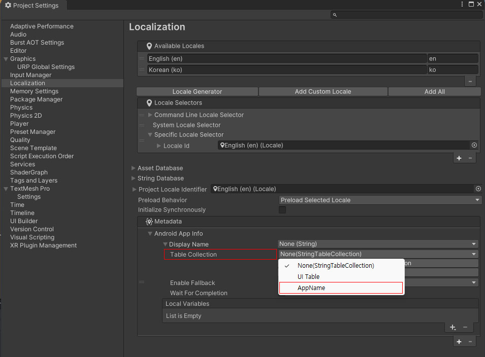 테이블 작성이 완료된 후 다시 Project Settings의 Localization에서 Table Collection의 항목의 테이블을 방금 만든 AppName으로 선택하시고
