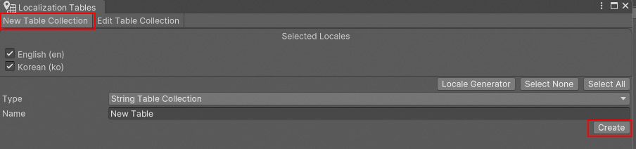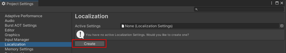 Project Settings 창에서 Localization > Create를 클릭합니다.