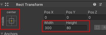 Anchors의 위치를 화면의 중앙에 크기를 300에 높이를 80으로 Font의 크기는 50으로 설정해 주었습니다.