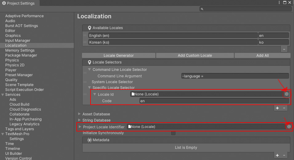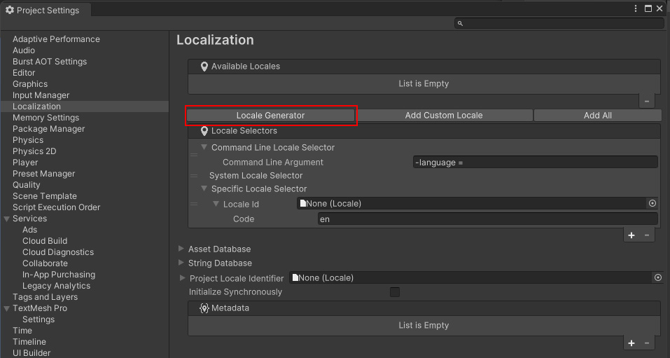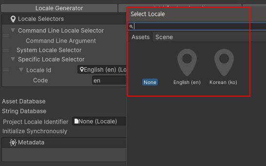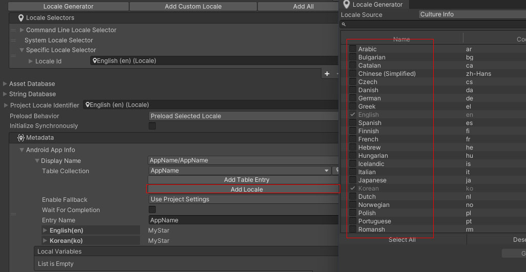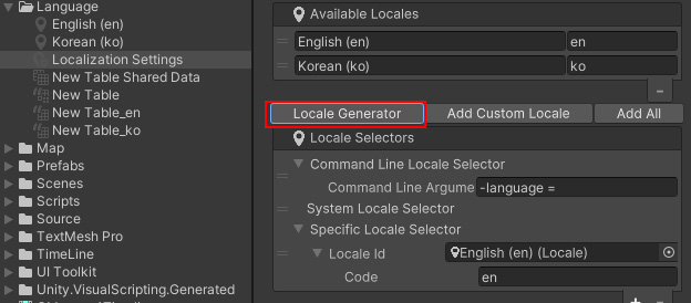 다른 언어도 추가하시려면 Language 폴더의 Localization Settings 선택 Locale Generator를 클릭하시면 추가로 선택 가능합니다.