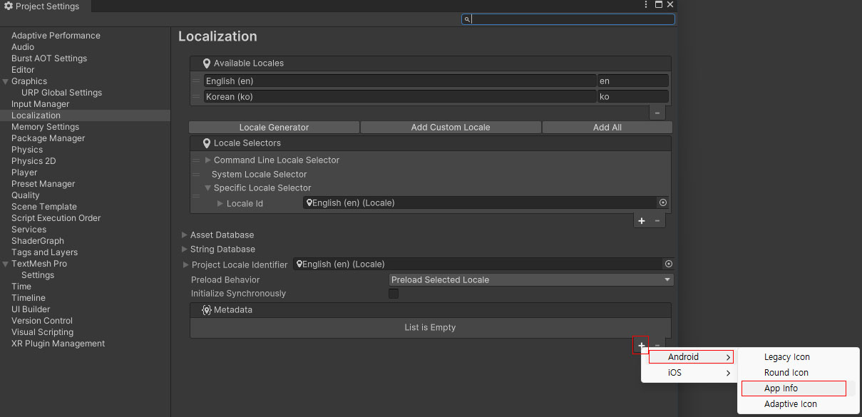 우선 Project Settings의 Localization에서 위 그림처럼 오른쪽 하단의 '+' 버튼을 클릭하시면 안드로이드 안에 App Info라는 항목을 선택해 줍니다.