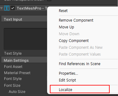 그럼 이미지처럼 메뉴에서 Localize를 선택해 줍니다.