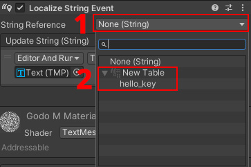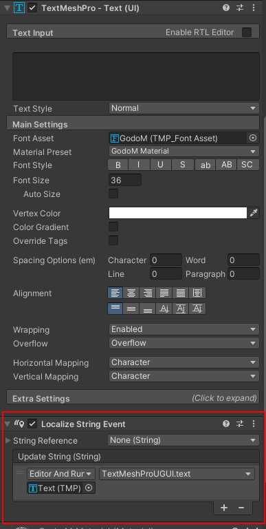 자 그럼 TextMeshPro창 아래 Localize String Event 메뉴가 하나 생성됩니다.