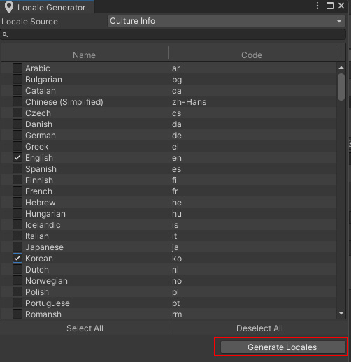 그럼 새창이 나오면서 게임에 적용될 언어를 선택할 수 있습니다. 우선 테스트로 화면과 같이 영어와 한국어를 선택한 후 Generate Locales를 클릭합니다.