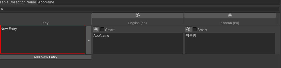 폴더에 저장하시고 나면 역시 나라별로 이름을 지정하실 수 있는 테이블이 나오며 위 이미지에서는 Key명이 New Entry로 나오지만 Key명을 "AppName"으로 주겠습니다.