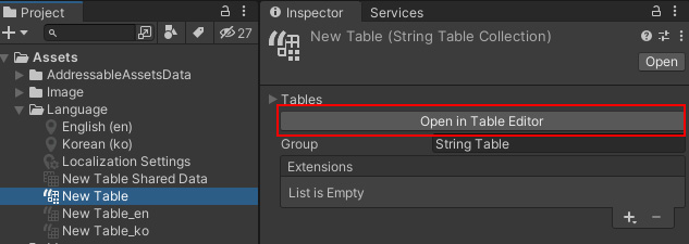 새로운 Table을 추가하려면 Language 폴더의 New Table을 선택 후 Open in Table Editor를 선택하면 새로운 Table을 추가하실 수 있습니다.