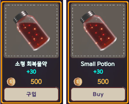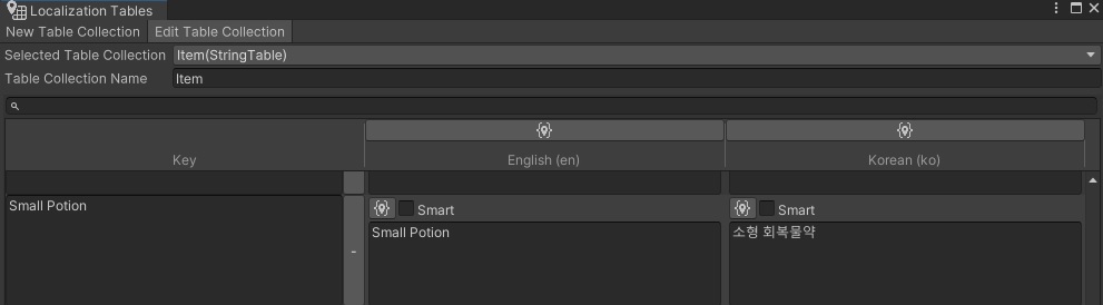 아이템의 데이터가 대충 위와 같이 있다고 치면 아이템 중 하나의 예로 itemName을 "Small Potion"으로 주고 위에서 만들었던 기존의 Localization Table이나 또는 새로운 Table 을 하나 만들어 Table의 key 값을 itemName 으로 넣어 줍니다.