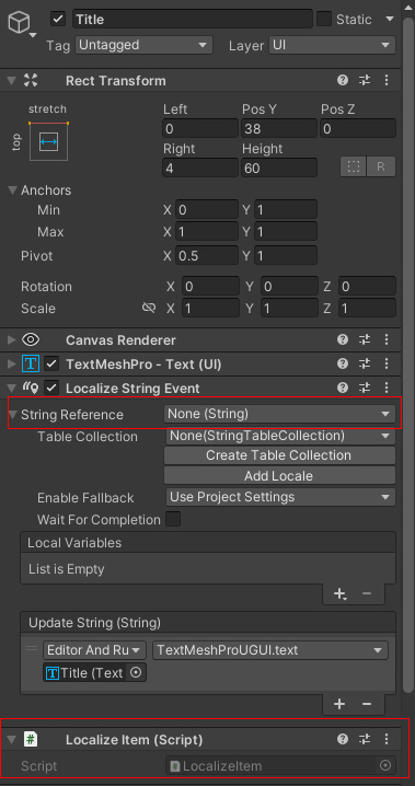 Title Text의 내용을 표시하기 위해 TextMeshProUGUI를 받아 오는 게 아닌 바로 위에서 만들었던 LocalizeItem을 가져옵니다.