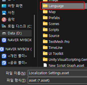 Create를 클릭하신 후 앞에 만들어 두었던 "Language" 폴더를 선택 후 저장.