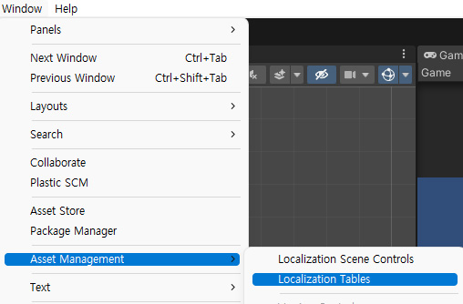 이제 유니티의 Window메뉴의 Asset Management > Localization Tables를 선택해 줍니다.