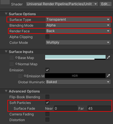 URP를 사용한다면 Universal Render Pipeline / Particles / Unlit의 Material을 아니면 Particles / Standard Unlit의 Material을 생성합니다.