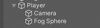 Hierarchy 창에서 Player라는 오브젝트 있으면 Player를 따라다니는 카메라와 안개용으로 사용될 Sphere를 하나씩 만들어 줍니다.