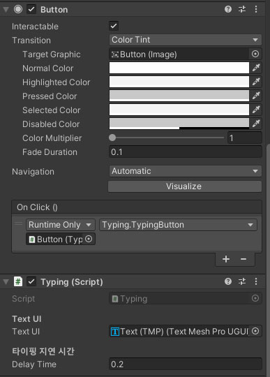 Button에 Typing.cs 스크립트를 넣고 Button 이벤트에 위 이미지처럼 TypingButton을 연결시켜 줍니다.