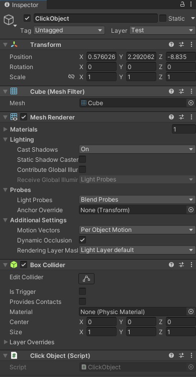 ClickObject.cs를 해당 오브젝트에 추가해 줍니다.