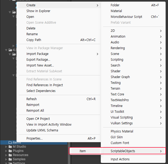 마우스 오른 버튼으로 Create > ScriptableObjects > Item으로 아이템을 생성해 주시면 됩니다.