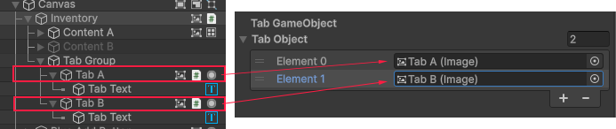 그 아래 Tab A와 다시 그 아래 Tab의 이름을 지정할 TextMeshPro를 달아 주세요