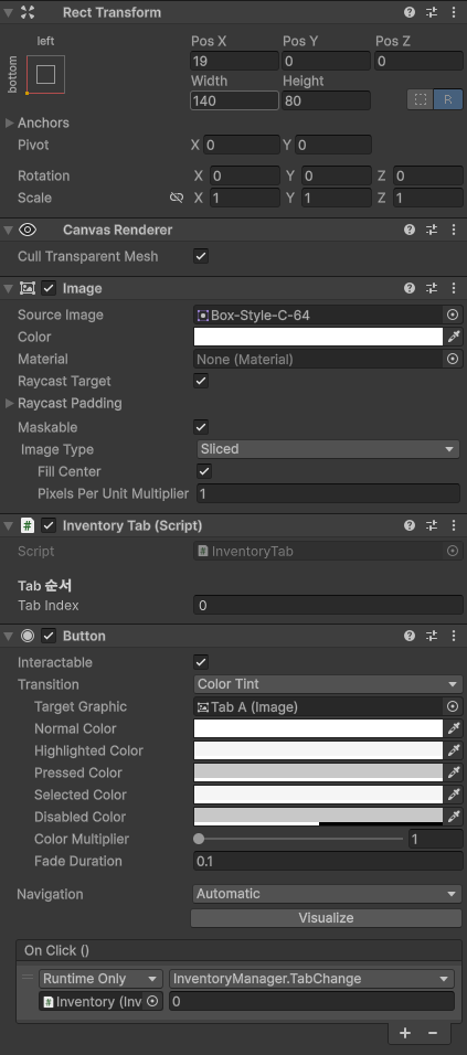 OnClick 이벤트에는 2부에서 만든 InventoryManager에 추가로 TabChange 메서드를 만들어서