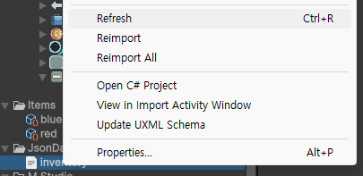 유니티 JsonData에 마우스 오른쪽 버튼을 클릭 후 Refresh를 클릭하시면 방금 저장된 Json Data가 보일 것입니다.