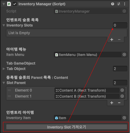 RefreshSlotsManual은 위 이미지의 "Inventory Slot 가져오기" 버튼에 연결될 메서드로 사용될 것입니다.